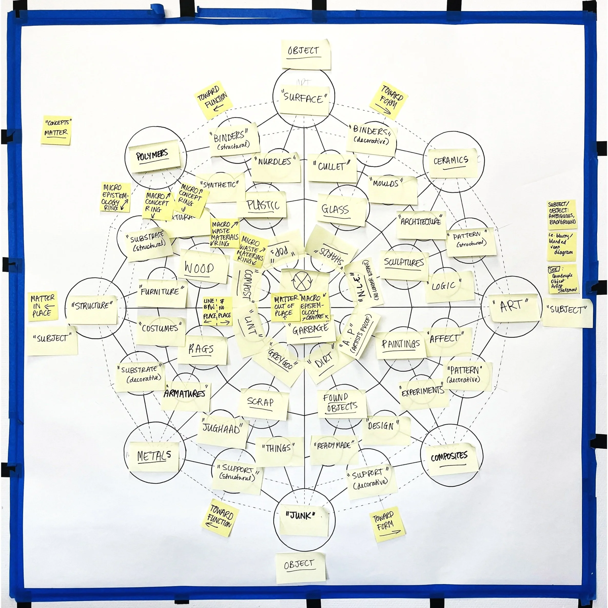 “Elements of Waste” (in development since 2018) is Keeley Haftner’s evolving visual artist statement and material rubric that frames her materially driven practice. Centered on garbage as an abstract concept capable of housing all matter, it takes the form of a circular diagram that organizes waste into eight interconnected Elements—Wood, Metal, Junk, Plastic, Glass, Ceramic, Pictures, and Fabric. Drawing on interdisciplinary influences such as Materials Science, the Bauhaus curriculum, and the waste industry, the framework operates as both a conceptual map and an editing tool, guiding Haftner’s intuitive and research-driven engagement with materials. As a neurodivergent artist, this evolving structure provides necessary parameters for organizing the symbolic, chemical, and ontological expansiveness of waste, allowing complexity to be engaged with clarity and intention rather than overwhelm.