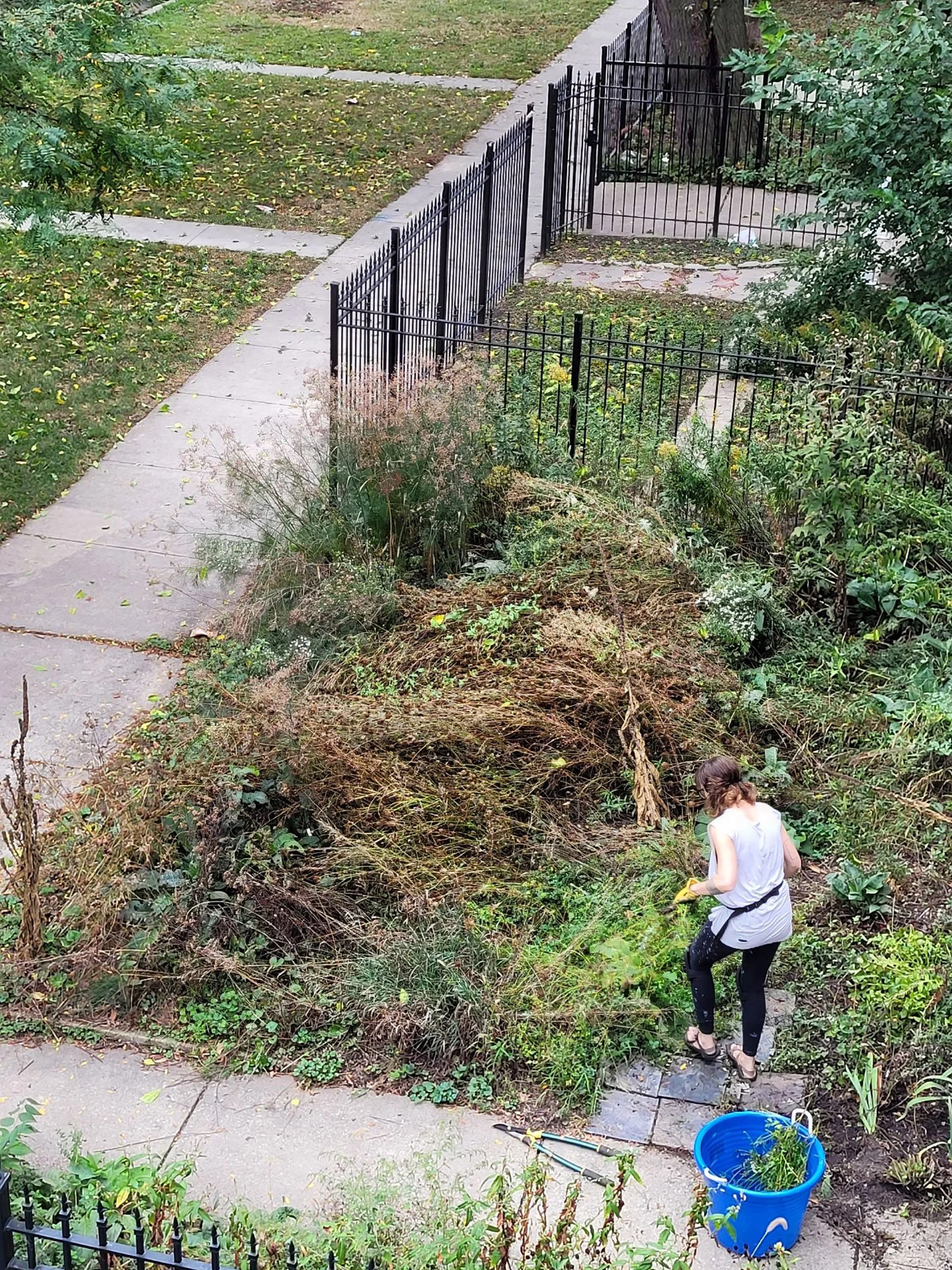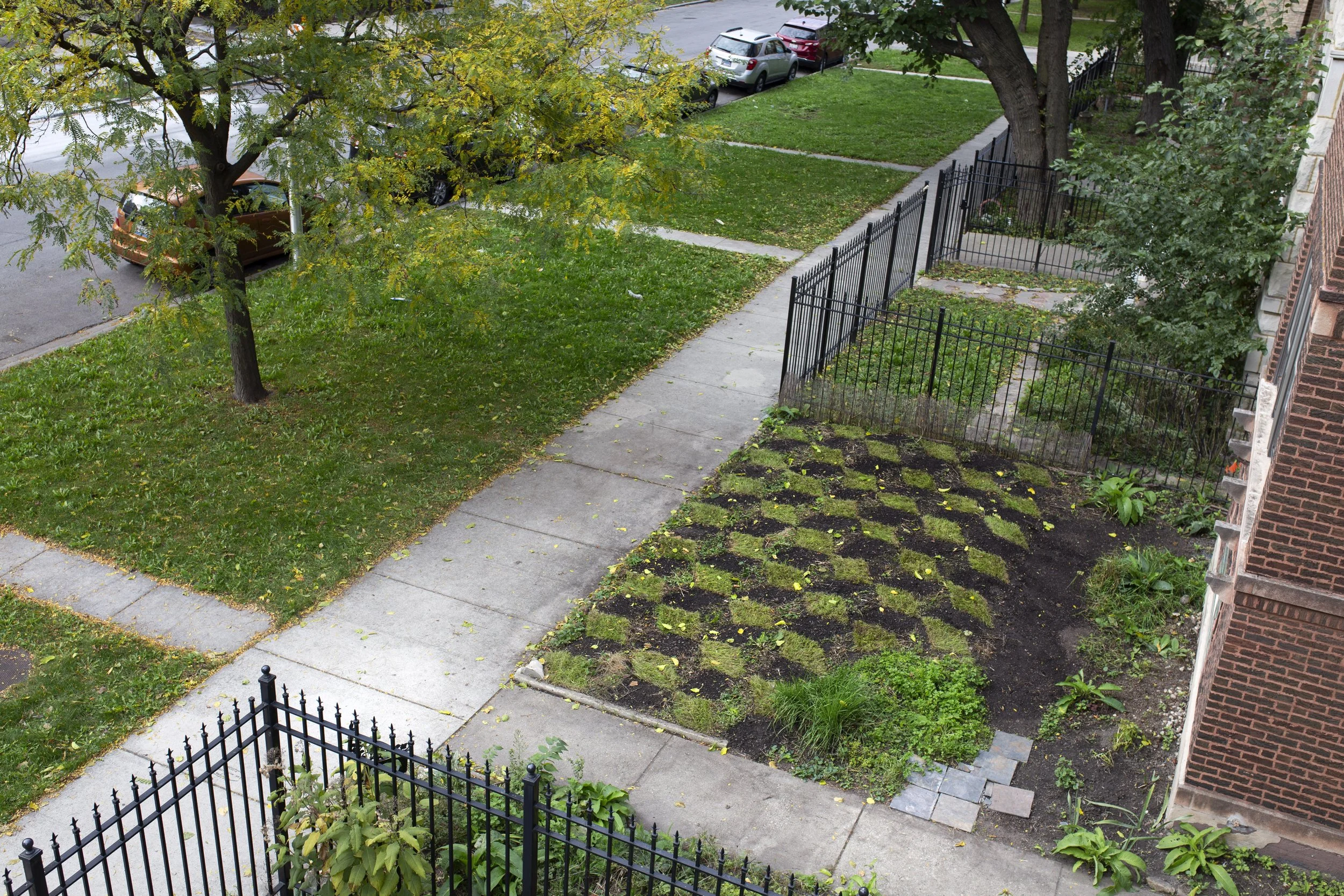 Tesselescence (Garden Apartment Gallery) was an outdoor installation by Keeley Haftner on the front lawn of Chicago’s Garden Apartment Gallery, founded by Marlene Krygowski. Using the tumbling blocks tessellation pattern, the work arranged the yard in three tones: cropped sections of the found overgrown garden, newly laid sod, and open soil seeded with bird- and butterfly-friendly plants.